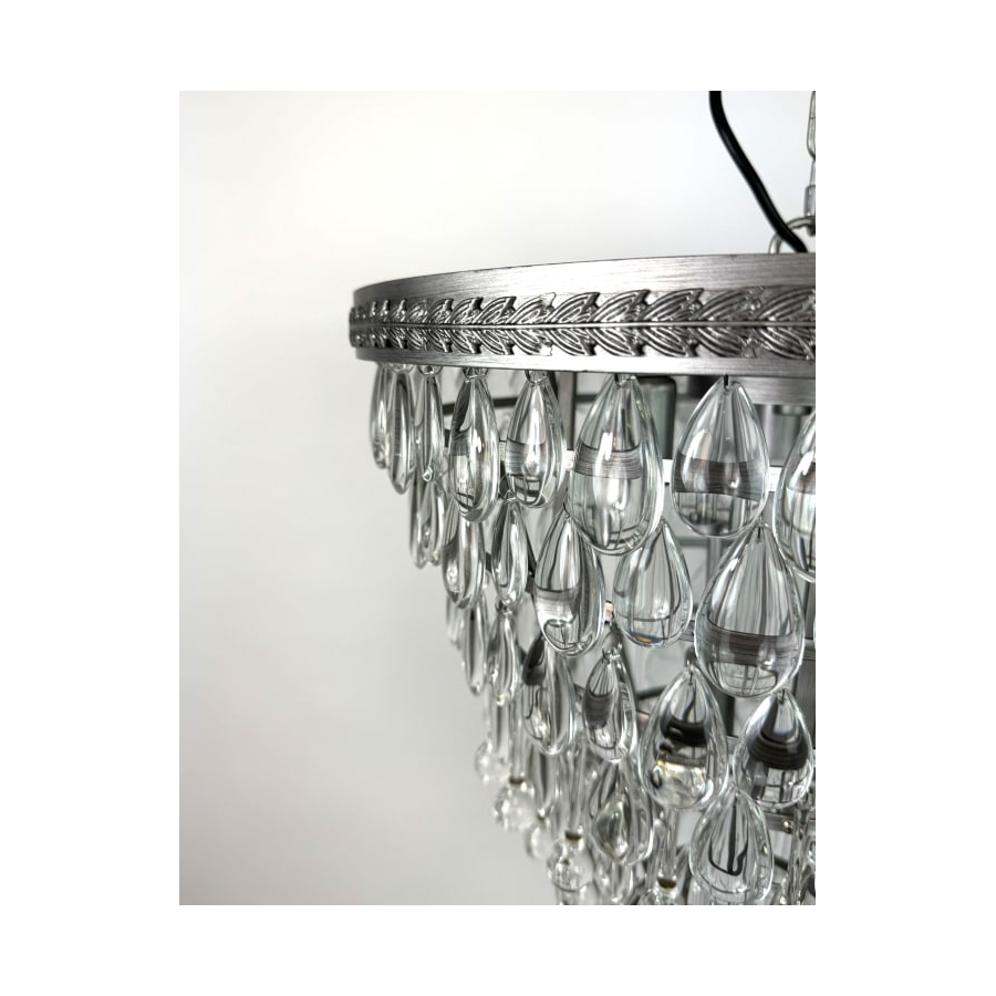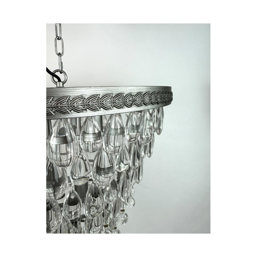 A beautiful rainfall shaped chandelier with a brushed silver colour frame. The frame has an intricate leaf detail and finished with clear glass droplets creating an exquisite display of light.