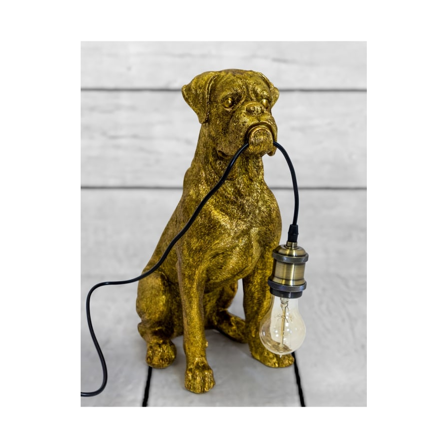 For the love of dogs! This wonderful lamp has a detailed boxer dog stem holding the lamp wire/bulb in its mouth. Finished in brushed antique gold .