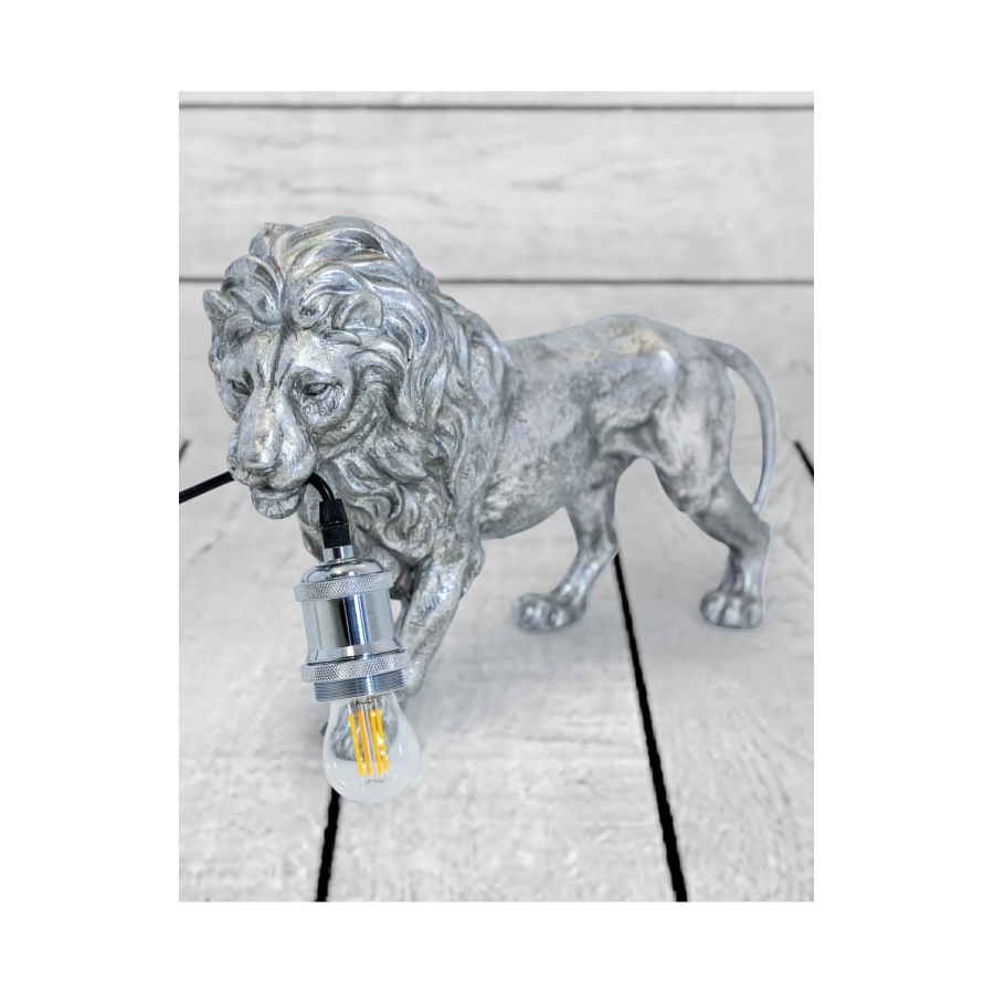 A beautiful detailed silver coloured lamp in a prowling lion shape. The light fitting is perched in the lions mouth creating an interesting piece.